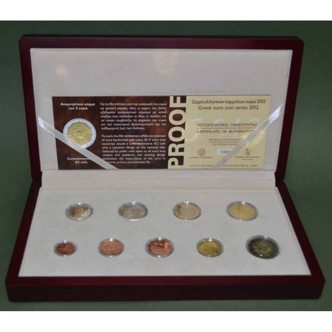 Περιέχει τα 8 ευρωνομίσματα και το αναμνητικό 2ευρο για τα δέκα χρόνια ευρώ σε ποιοτική κοπή Απόδειξη.