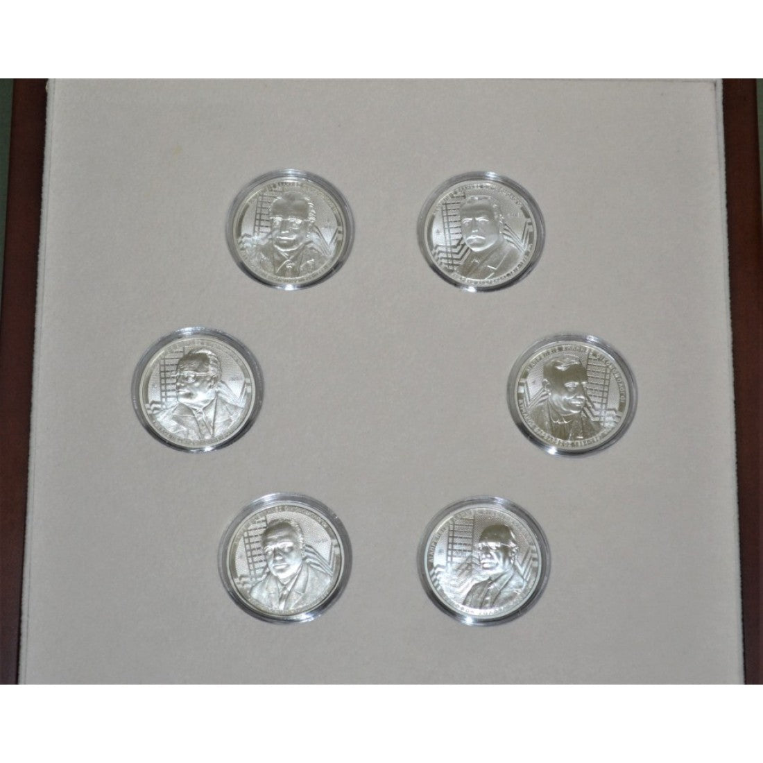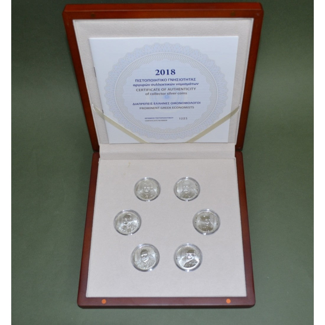 Περιέχει 6 αργυρά νομίσματα με θέμα ΔΙΑΠΡΕΠΕΙΣ ΕΛΛΗΝΕΣ ΟΙΚΟΝΟΜΟΛΟΓΟΙ, σε ποιότητα κοπής Απόδειξη.